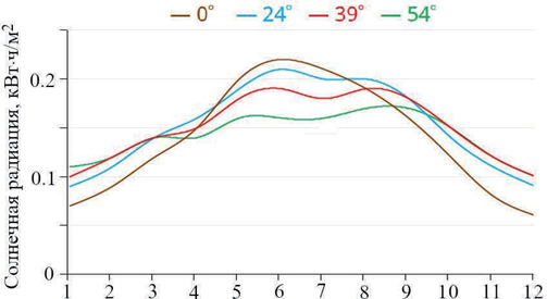 F i g . 4 . Receipt of solar radiation at different an- gles of inclination of the photomodule, the angles equaling 0°; 24°; 54°; 39° (the optimal angle for Ogurchinsky Island)