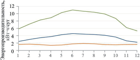 Р и с . 6 . Динамика среднесуточной энергопроиз- водительности ВЭС и СЭС при выработке электро- энергии и теплой воды на о-ве Огурчинском по ме- сяцам: оранжевая линия – выработка ВЭ, синяя ли- ния – выработка СЭ, зеленая линия – переработка СЭ в тепловую.