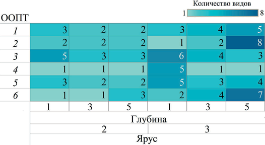 «ПАК у м. Фиолент» на глубине 1 м, минимальное (один вид) – ГПЛЗ «Ка- раньский» и ПП «ПАК у м. Сарыч» на глубине 3 м. У м. Лукулл количество видов во втором ярусе незначительно росло при увеличении глубины до 5 м.