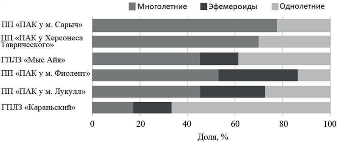 Суммарно наибольший вклад многолетних водорослей составлял 50–70 % в акваторииях ПП «ПАК у Херсонеса Таврического» (глубина 1 м), ПП «ПАК у м. Сарыч» и ГПЛЗ «Мыс Айя» (глубина 3 и 5 м), при этом в составе фитоценоза двух последних объектов не обнаружены сезонные виды или эфемероиды.