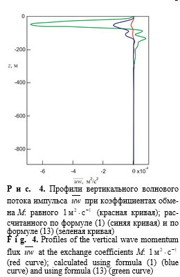 вертикальный волновой поток импульса заметно меньше по модулю, чем при коэффициенте обмена, зависящем от масштаба явления по формуле (1). В свою очередь, в последнем случае поток импульса заметно меньше по абсолютной величине, чем при коэффициенте обмена, задаваемом формулой (13), учитывающей стратификацию. На дисперсионных кривых выбор коэффициента обмена почти не сказывается, однако декремент затухания волны чувствителен к этому выбору. Декремент затухания волны при