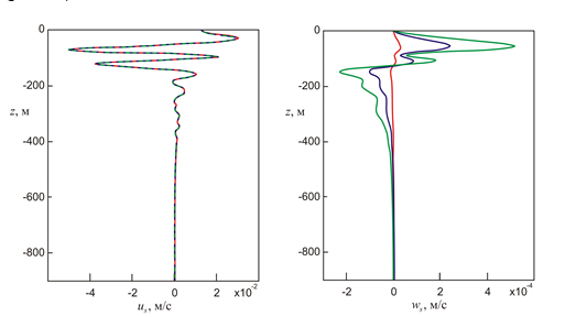 . Зависимость (13), учитывающая влияние стратификации на коэффициент вертикального турбулентного обмена, дополнительно увеличивает вертикальную компоненту скорости стоксова дрейфа. Вертикальная компонента скорости стоксова дрейфа играет существенную роль в вертикальном переносе тепла и соли.