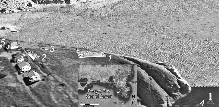 Laser interference complex. The laser interference measuring complex is situated on the Gamov Peninsula of Primorsky Krai, with its central point located at 42.58°N and 131.15°E on the territory of the Cape Shultz Marine Experimental Station (MES). The complex comprises a laser nanobarograph, laser strainmeters with measuring arm lengths of 52.5 and 17.5 m, and a laser meter to measure hydrosphere pressure variations (Fig. 2).