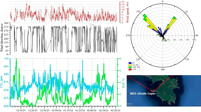 In general, such a level of CO2 concentration vividly illustrates the increased level of its content in the atmosphere in winter. This is due both to the peculiarities of the atmospheric transfer (mainly from the continental part) and to the almost complete slowing down of photosynthesis and vegetation processes (carbon dioxide drainage is difficult) due to the low temperatures. Furthermore, from December 2023, a characteristic diurnal variability of carbon dioxide concentrations has been detected, with an increase during the day and a smooth decrease at night (with a minimum in the morning), with an average amplitude of 1.3 ppm. This appears to be related to local features of the atmospheric circulation and a change in the direction of the prevailing wind in the land-sea system.