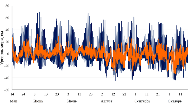 Р и с. 2. Колебания суммарного уровня L (синяя кривая) и его непериодической составляющей L-rs (оранжевая кривая), по данным АБС «Горбуша», май ‒ октябрь 2024 г.