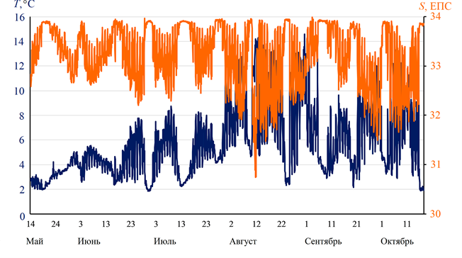 F i g. 5. Variations in seawater temperature (blue curve) and salinity (orange curve) based on the “Gorbusha” ABS data, May ‒ October 2024