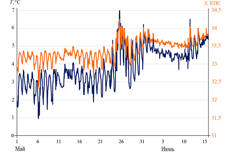 Р и с. 6. Вариации температуры (синяя кривая) и солености морской воды (оранжевая кривая), по данным АБС «Астарта», май – июнь 1999 г.