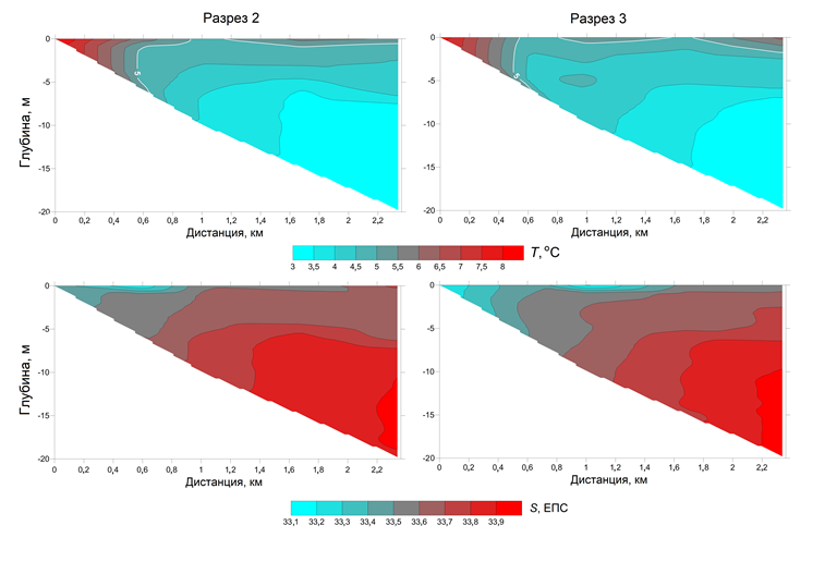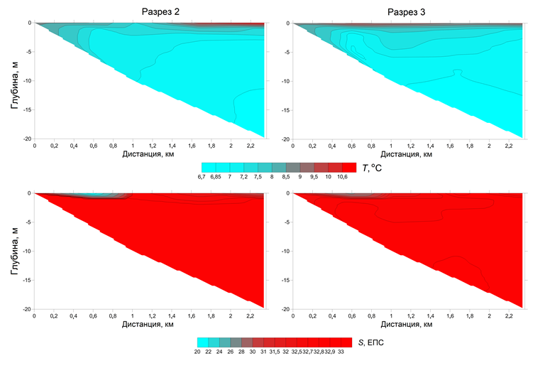 Для изучения особенностей структуры вод в изучаемом районе были выполнены океанологические зондирования на прибрежном участке на четырех поперечных берегу разрезах (от берега до изобаты 20 м, расстояние от уреза воды около 2,4 км). Измерения проводились портативным зондом ACTD-CMP с борта моторной лодки. Построение вертикальных разрезов осуществлялось при помощи программы Surfer. Ниже рассмотрены результаты исследований на двух разрезах (2 и 3), расположенных ближе к устью р. Горбуши (см. рис. 1).