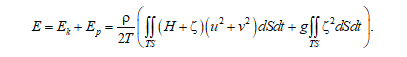 В работе [3] для Азовского моря в качестве вынуждающей силы задаются колебания уровня воды (нагона) у Керченского пролива. Резонансная частота устанавливается по максимальному значению полной энергии, наблюдаемому при изменении частоты возбуждающих колебаний. Общая энергия определялась как сумма кинетической и потенциальной энергии.