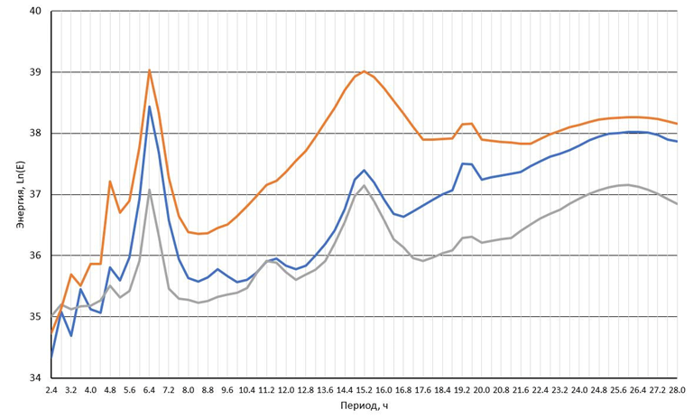 Наиболее сильно выделяющийся локальный максимум энергии наблюдался несколько раз – для значений периода 6,4; 15,2; 19,2 и 26 ч (рис. 1). Это наблюдалось и при ветрах СВ – ЮЗ, и при смене восточного ветра на штиль, и при колебаниях атмосферного давления. Кроме того, можно выделить еще несколько небольших всплесков энергии. Данные частоты наблюдались для всех румбов ветра, что соответствовало как продольным, так и поперечным воздействиям на поверхность моря. Отличалась только величина полной энергии.