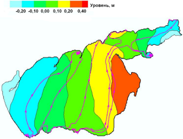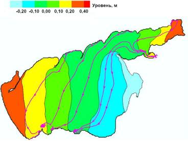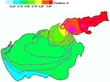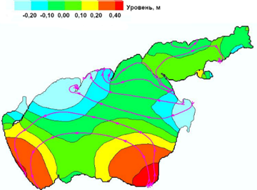 При периоде колебаний ветра 26 ч движение воды в Азовском море имеет циркуляционный характер с образованием нескольких зон циркуляции как в самом Азовском море, так и в Таганрогском заливе. На рис. 2 показано распределение уровня водной поверхности и линии тока с максимумом в Таганрогском заливе (0,85 м) и минимумом у Арабатской Стрелки (−0,15 м), которые сменяются на минимум в Таганрогском заливе (−0,74 м) и максимум у Арабатской Стрелки (0,31 м). Узловая линия сейши проходит примерно от основания Должанской косы к Бердянску. Подобный результат описан в работе [9].