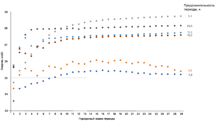 F i g. 6. Total energy for peak values of oscillation periods (h) under the influence of atmospheric pressure on the Azov Sea surface