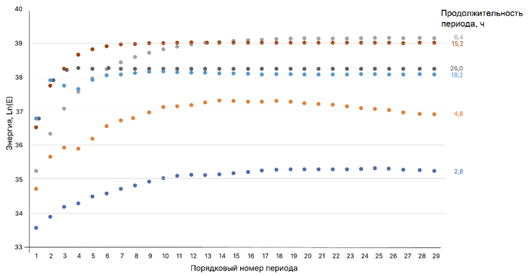 При дальнейшем внешнем колебательном воздействии на поверхность моря с периодами 6,4; 15,2; 26, а также 19,2 ч значение полной энергии продолжает устойчиво увеличиваться, что говорит о возможном наступлении резонанса (рис. 5). Заметим, что частота при периоде 19,2 ч ранее не была рассмотрена как резонансная. Для частот с периодом колебаний 2,8; 4,8 ч дальнейшее внешнее воздействие приводит к уменьшению полной энергии, что говорит о затухании колебаний.