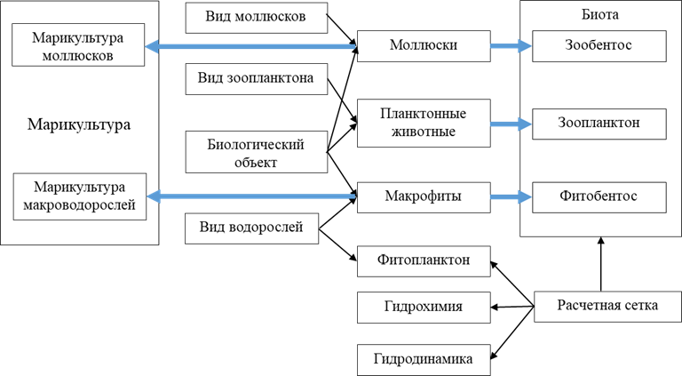 Активное выращивание марикультуры поднимает большое количество вопросов, связанных с функционированием в прибрежной зоне морских экосистем, которые характеризуются большим числом физических, химических и биологических процессов. Как следствие, компоненты прибрежных экосистем взаимодействуют друг с другом и с морской средой посредством множества прямых и обратных связей. Успешность морского хозяйства определяется тем, насколько хорошо объекты марикультуры интегрируют в экосистему, сложившуюся в выбранном морском районе. Это значит, что обмен веществом и энергией между марикультурой и средой должен обеспечить устойчивый рост культуры и не только не ухудшить, но и по возможности улучшить состояние самой экосистемы. Оценить вышеуказанные процессы взаимодействия можно при помощи комплексных экологических моделей с физической, химической и биологическими составляющими. Рассмотрим ряд существующих моделей, которые имитируют функционирование марикультуры во взаимодействии с окружающей средой.