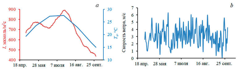 Поле фитопланктона задавалось как множество объектов диатомовых микроводорослей с высокой скоростью роста. Управляющими переменными модели являлись освещенность на поверхности воды, температура воздуха и скорость ветра (рис. 2). Временной ряд освещенности поверхности задавался в соответствии со средними оценками инсоляции над Черным морем [24]. Суточная изменчивость моделировалась синусоидой, температура воздуха и скорость ветра – по данным ERA–Interim (2007 г.) с дискретностью три часа. Длительность интегрирования составила 5 мес с мая по октябрь – период активного роста устриц.