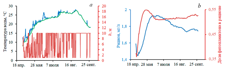 Р и с. 3. Условия морской среды: температура верхнего (синяя кривая) и нижнего (зеленая кривая) слоев воды, толщина верхнего слоя (а); концентрация кормовой взвеси и соотношение между составляющими рациона моллюсков – фитопланктоном и взвешенным органическим веществом (b)