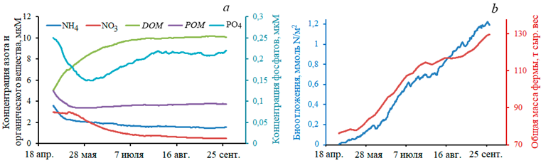 Р и с. 5. Графики динамики: гидрохимических характеристик для третьего года культивирования устриц (a), биоотложений и общей массы культивируемых устриц (b)