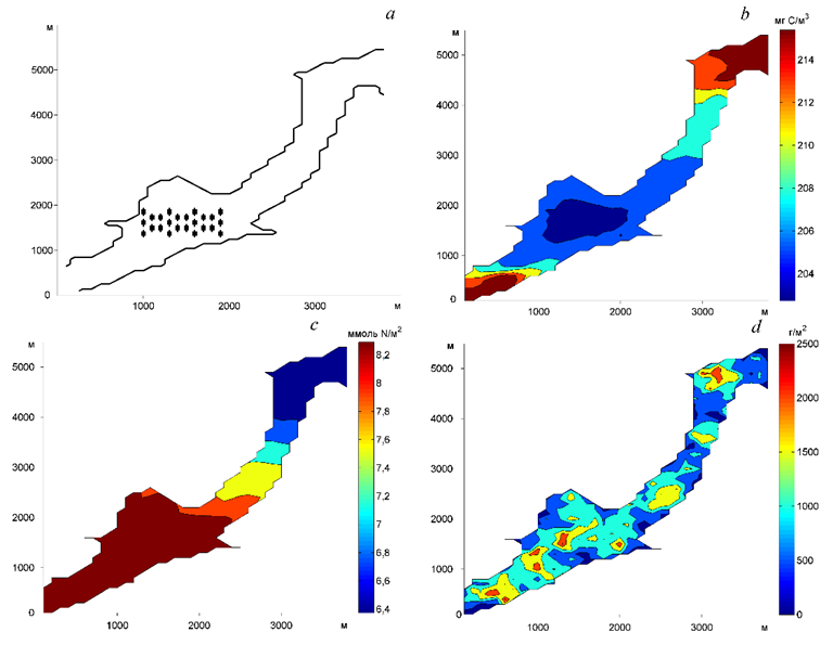 Р и с. 6. Схема устричной плантации (а), биомасса фитопланктона (b), биоотложения (c), биомасса фитобентоса (d). Поля показаны по состоянию на последний день расчета 30.09.2007 г.