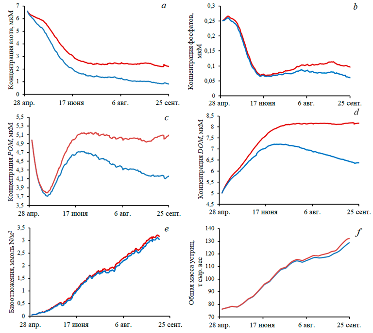 Р и с. 7. Сравнение двух численных экспериментов – с включением макрофитобентоса (синяя кривая) и без него (красная кривая): концентрация суммы аммония и нитратов в воде (а), фосфатов (b), РОМ (с), DOM (d), биоотложений в единицах азота (е), масса культивируемых на ферме устриц (f)